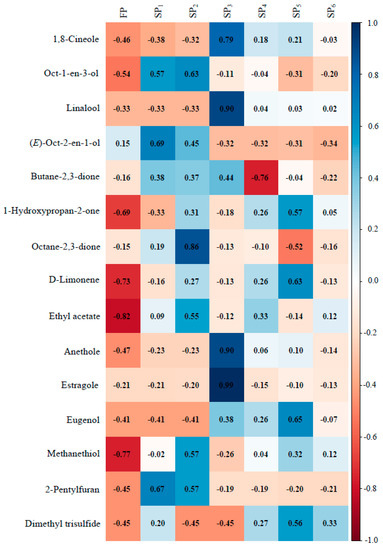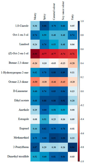 3.6. Relationship between Sensory Evaluation and Odour-Active Compounds