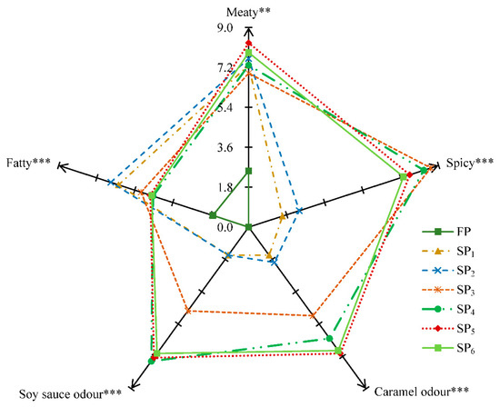 The odour sensory profiles of the fresh and stewed pork. Asterisks indicate significant (** p ≤ 0.01; *** p ≤ 0.001) differences of means in descriptor intensities. FP, fresh pork; SP1, stewed pork with water; SP2: stewed pork in water and salt; SP3: stewed pork in water, salt and spices; SP4: stewed pork in water, salt, spices and soy sauce; SP5: stewed pork in water, salt, spices, soy sauce and sugar; SP6: stewed pork in water, salt, spices, soy sauce, sugar and cooking wine.