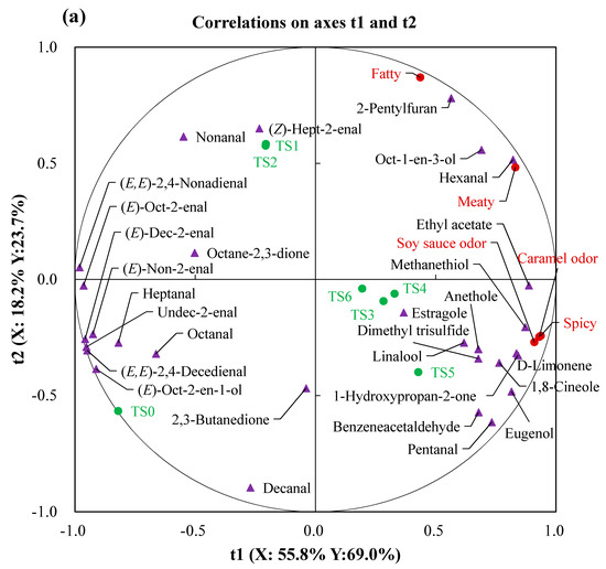 (a) PLSR loading for the odour attributes (Y variables) and the odour-active compounds of the fresh and stewed pork (X variables). (b) Heat map illustrating the Pearson correlation between descriptor intensities and proportion of OAVs of the odour-active compounds calculated by PLSR. The green circle dots represent 7 pork samples, the red circle dots represent 5 aroma attributes and the purple triangle dots represent 29 odour-active compounds.