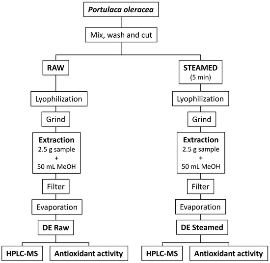 For both raw and steamed samples, aerial parts were lyophilized (Lyoquest -55 ECO, Telstar; Barcelona, Spain) and crushed with a grinder. Ultrasound-assisted extraction was done by placing 2.5 g of dry material in 50 mL MeOH for 10 min (Qsonica Sonicators; Newton, CT, USA) with a power of 55 W and a frequency of 20 kHz (50% power). Each sample was extracted in triplicate. Then, solutions were filtered through Whatman No.1 filters and the solvent was evaporated under reduced pressure in a rotary evaporator at 40 °C. Dried extracts (DE) were stored at −20 °C until analysis. A scheme of the process is shown in Figure 2.