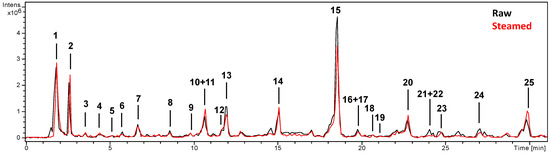 Compounds characterization was carried out by mass spectrometry, using both negative and positive ion modes, although most of the compounds were identified in negative mode (Table 1). The base peak chromatograms of raw and steamed extracts of Portulaca oleracea aerial parts are shown in Figure 3. We identified or tentatively characterized 24 compounds; almost 30% were phenolic acids and 25% flavonoids. There was a higher percentage (33%) that corresponded with alkaloid compounds, specifically oleraceins.