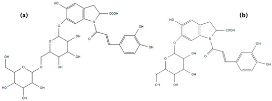 Compound 14 showed an [M-H]− ion at m/z 518 and fragment ions at m/z 356 (neutral loss of 163 Da corresponding to a glucoside molecule ([M-Glc-H]−)), m/z 246 (neutral loss of 110 Da from a 1,2-dihydroxybenzene molecule ([M-Glc-C6H5O2-H]−)) and m/z 202 (neutral loss of 44 Da from the previous fragment ion due a carboxylic group ([M-Glc-C6H5O2-CO2-H]−)). This compound has not been previously described and, according to the fragmentation pattern, we propose a new compound called oleracein Y, whose structure was determined as 5-hydroxy-1-caffeic acyl-2,3dihydro-1H-indole-2-carboxylic acid-6-O-glucoside (C24H25NO12) (Figure 4), similar to oleracein V structure but without a hydroxyl group (C24H25NO13) [12]. The molecular formula proposed for compound 14 (oleracein Y) was also confirmed by exact mass using Q-TOF results.