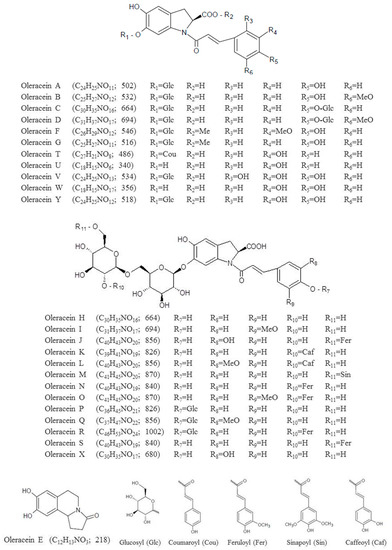Chemical structures and molecular ions [M-H]− of oleraceins A-Y.
