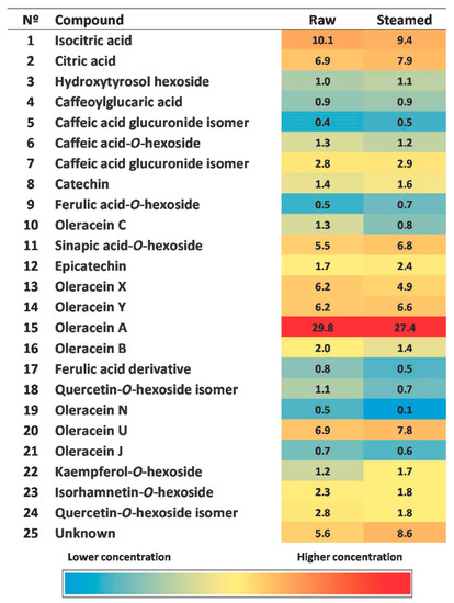 Sinapic acid-O-hexoside was the phenolic acid found in greater quantity, reaching values of 38 mg/100 g DE and 32 mg/100 g DE in raw and steamed extracts, respectively, which meant 27% of the total phenolic acids in both cases. A value of 22.1 mg/100 g DE was previously reported in literature for this plant [11].