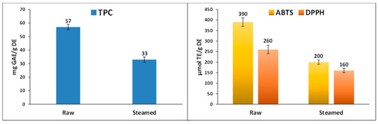 The antioxidant capacity of Portulaca oleracea extracts was also evaluated; results are summarized in Figure 7. The study of the antioxidant capacity of plant extracts is of great interest in order to provide new and safer natural antioxidants for pharmaceutical and food industries. So, in this work, free radical quenching (ABTS+ and DPPH assays) was studied to examine the antioxidant effects of raw and steamed Portulaca oleracea extracts. In both assays, the antioxidant effects showed a similar trend to total bioactive compounds, decreasing after the steaming process, in agreement with the initial hypothesis of the work. The values for ABTS·+ and DPPH assays of the raw extract were 390 µmol TE/g DE and 260 µmol TE/g DE, and for the steamed extract were 200 µmol TE/g DE and 160 µmol TE/g DE, so the raw extract was more active on free radicals than the steamed extract. However, it can be observed that a higher decrease was observed in ABTS values with respect to DPPH ones. A previously reported value in an ABTS assay for raw purslane was 102.7 µmol TE/g DE, lower than that obtained in our study [43]. In another work on aerial parts of Portulaca oleracea, the cooking process with lemon juice as additive increased the antioxidant activity compared to raw samples in the DPPH assay [24]. The decrease in antioxidant activity observed after the steaming process is in agreement with the decrease in phenolic content (Table 2). Considering that the decrease of concentration was similar in all compounds (as well as TIPC), the lower antioxidant activity in steamed samples cannot be attributed to particular compounds. Although the observed antioxidant capacity (in both raw and steamed samples) was mainly due to the most abundant compounds, the whole extract must be considered to account for the antioxidant potency.
