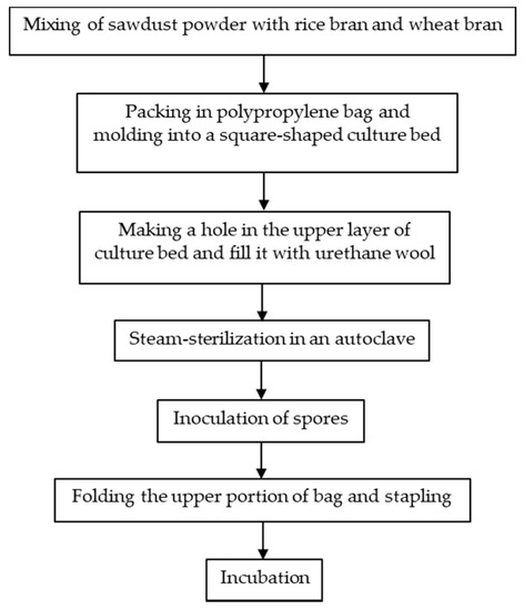 Japan was one of the countries that first started the artificial cultivation of G. frondosa in the mid-1980s. There are in general three methods for the artificial cultivation of the G. frondosa fruiting body, they are bottle culture, bag culture and outdoor bed culture. Bag culture is the most popular cultivation method in Japan [2] because of its advantages such as the low cost of plastic bags, small space requirements and easily-controlled indoor environment. Bag culture can achieve higher yields of mature G. frondosa mushrooms than bottle culture and requires a shorter cultivation time than outdoor bed cultures. As shown in Figure 1 [2], the major steps of bag cultivation include substrate preparation, substrate sterilization, mycelium inoculation and incubation. In addition to the fruiting body, there is also an increasing demand for G. frondosa’s mycelium and its bioactive metabolites. Solid-state fermentation (SSF) [3] and submerged fermentation [4] are two common methods of mycelium cultivation. A common substrate for SSF is sawdust supplemented with rice bran or wheat bran [5]. Submerged or liquid fermentation is usually more efficient, providing a higher mycelial productivity in a shorter time, requiring smaller plant space and allowing for more effective product quality control [6]. A typical submerged fermentation process is presented in Figure 2.