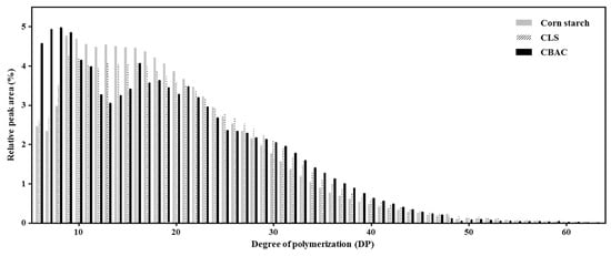 The structural characteristics of freeze-thaw stable starch were analyzed via HPAEC. Compared to the corn starch, in CBAC the relative amounts of side chains below DP 10 and in the range of DP 28 to DP 47 increased. Consequently, the relative amounts of the other chain lengths in CBAC (DP 10–27, >DP 48) decreased (Figure 1). Both CBAC and CLS typically contained larger amounts of B2 and B3 chains than corn starch. In particular, CBAC possessed relatively more long side chains (DP 31–47) than CLS (Figure 1).