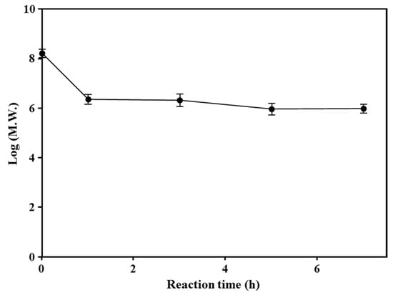 Time course analysis of the molecular weight (Mw; g/mol) of starch during enzymatic modification. The Mw of corn starch samples treated with (CGTase) and a branching enzyme with various incubation times was measured using size exclusion chromatography-multiangle laser light scattering (SEC-MALLS).