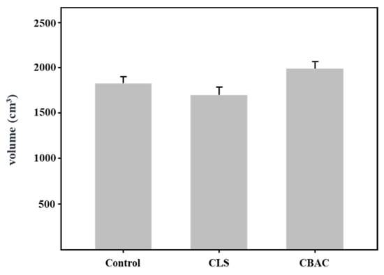 To investigate the effect of modified starch on freeze-thaw stability, CLS and CBAC were added to bread dough, respectively. The fermented doughs were subjected to the freeze-thaw process three times, as described in the Material and Methods, and the bread was then baked. As shown in Figure 3, the bread samples were compared in terms of volume; the volumes of the control, CLS-, and CBAC-added breads were 1833.33, 1706.67, and 1993.33 cm3, respectively. Relatively, the bread made with the CBAC had the largest volume (9% larger than the control bread volume). However, there was no significant difference in volume between the bread made with CLS and the control bread.