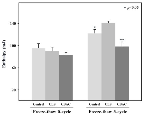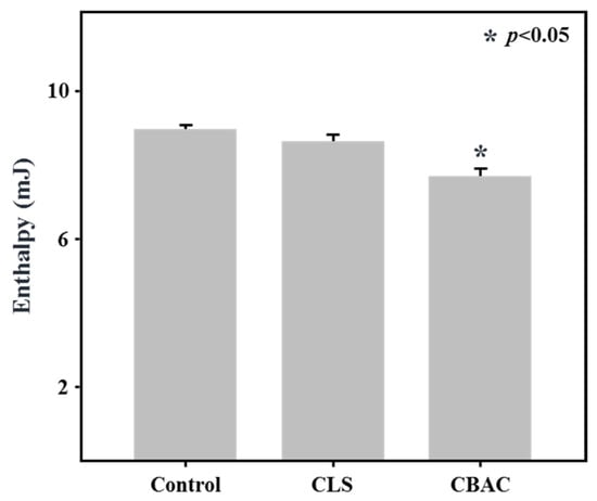 Enthalpy of the freezable water in frozen doughs containing different starches. The dough treated with CBAC had the lowest freezable water enthalpy after a three-cycle freeze thaw process. Asterisk (* or **) indicates a significant difference at p < 0.05 following the Kruskal–Wallis H test.