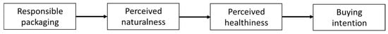 As can be seen in Figure 1, this theoretical explanation is founded on the sequential mediation effects of two variables: the food’s perceived naturalness and healthiness. More precisely, the extent to which a food package is perceived as responsible (i.e., recyclable, reusable, compostable) is hypothesized to have a positive impact on the perceived naturalness of the food product. This theoretical relationship is based on the studies by Steenis et al. (2017) [45], Marckhgott and Kamleitner (2019) [43], and Vermeir and Roose (2020) [36], among others. In turn, the perceived naturalness of the food product is presumed to have a positive impact on its perceived healthiness. This theoretical relationship follows from research conducted by Rozin et al. (2012) [14] and Binninger (2017) [42]. Finally, the model proposes that the greater the perceived healthiness of the food product, the stronger consumers’ intention to buy it. These theoretical relationships lead us to posit the following general research hypothesis:
