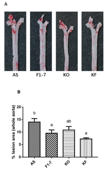 All experiments were performed in accordance with the British Animal (Scientific Procedures) Act 1986 (PPL 70/7652) and were approved by the Laboratory Animal Ethics Committee of the Ocean University of China (approval number: SPXY2020060502). A number of 24 male AopE−/− mice on a C57BL background at 8 weeks of age were purchased from Beijing Vital River Laboratory Animal Technology Co., LTD (Beijing, China). After being adaptively fed for 7 days, the AopE−/− mice were randomly divided into 4 groups with 6 mice in each group, and the specific groups were as follows: (1) atherosclerosis group (AS): 0.25 mL of PBS gavage daily; (2) Bif. animalis F1-7 intervention group (F1-7): 0.25 mL of daily gavage containing 1 × 108 CFU probiotic; (3) KO group (KO): 0.25 mL of KO solvent (1.5 mg KO/day); (4) KO + Bif. animalis F1-7 intervention group (KF): 0.25 mL of daily gavage containing 1.5 mg of KO and 1 × 108 CFU probiotic agents. The high-fat diet was provided by Beijing Keao Xieli Feed Co., LTD (Beijing, China), and the composition of high-fat feed is shown in Table 1. The mice were exposed to a 12 h light/dark cycle, and was maintained at a temperature of 23 ± 2 °C and humidity of 65 ± 15%. Mice were fed a high-fat diet during the experiment and were treated with the Bif. animalis F1-7, KO, and KO combined with Bif. animalis F1-7 from week 6. The experiment lasted for 16 weeks. The day before the end of the experiment, adequate feces of mice were collected and stored aseptically at −80 °C. The mice fasted overnight. After the mice were anesthetized, the plasma was collected and centrifuged at 4000× g for 15 min. The upper serum was stored at −80 °C before use. The liver and intestinal tissues were collected and part of the tissues were fixed with 4% paraformaldehyde fixative, the other part was preserved for other determination. The aortas, aortic roots, and arches were excised for histological examination.