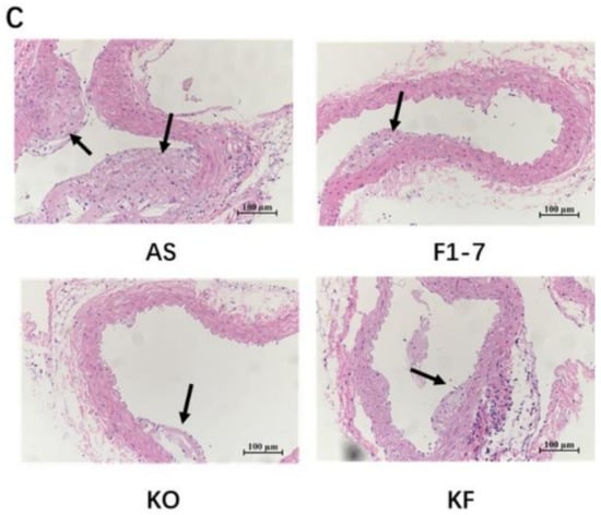 After intervention with KO and probiotics, the results of the oil red O staining of aorta are shown in Figure 1A. The atherosclerotic lesions of mice were aggravated in the AS group. The intervention of Bif. animalis F1-7, KO, and KO combined with Bif. animalis F1-7 significantly reduced the scope of the atherosclerotic lesion. The analysis of plaque coverage in Figure 1B showed that, compared with the AS group, treatment with Bif. animalis F1-7 reduced the lesion area by 32% and with KO by 23%. The plaque area in the KF group was reduced by 48%. H&E staining of the aorta section analysis confirmed that, in the AS group, the cardiovascular endothelial cells of the AopE−/− mice were widely injured and lipid deposition was observed. The inner wall of the aorta was obviously marked with large plaques (Figure 1C). In the Bif. animalis F1-7, KO, and KF groups, the cardiovascular membranes of mice were slightly damaged and a small amount of plaque was attached.
