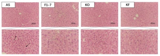 H&E staining of liver tissues in mice showed that the hepatocytes of mice in the AS group were swollen, with loose cytoplasm and lipid droplet vacuoles of different sizes (Figure 2). All intervention groups were able to improve the lipid accumulation in the liver and alleviate the degree of liver steatosis. The KF group had less lipid deposition in hepatocytes, and the effect was significantly better than those of Bif. animalis F1-7 and KO groups.