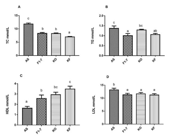 Influence of KO and the mixture of KO and Bif. animalis F1-7 on serum lipids (n = 6). (A) TC, (B) TG, (C) HDL, and (D) LDL. Different letters indicate significant differences from each group, p < 0.05.