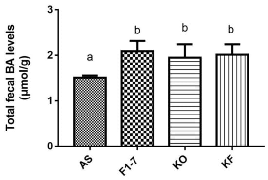 Total bile acid (TBA) levels of mice in feces (n = 4). Different letters indicate significance (p < 0.05).