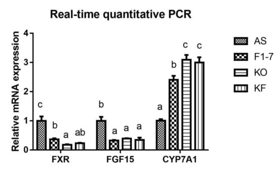 Relative mRNA levels of intestine FXR, FGF15, and liver CYP7A1 genes involved in lipid metabolism (n = 4). Different letters indicate significant differences from each group, p < 0.05.