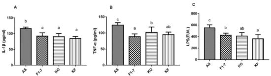 The plasma IL-1β (A), TNF-α (B), and LPS (C) levels were measured by ELISA (n = 5). There were statistically significant differences between groups of different letters, p < 0.05.