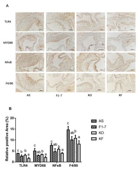 Immunohistochemical staining of TLR4 showed that in the atherosclerosis model group, the TLR4-positive regions in the Bif. animalis F1-7, KO, and KF groups were significantly reduced (Figure 7). Compared with the AS group, the KO group decreased the expression of TLR4 by 22%, with no statistical difference from the Bif. animalis F1-7 group. The KF group decreased by 59%, better than that of the Bif. animalis F1-7 and KO groups (p < 0.05). Both intervention groups could decrease the expression of MYD88 and reduce the pro-inflammatory signal transduction, and the KF group had a better effect than the KO group. There was no significant difference between KF and Bif. animalis F1-7 groups. The results of NFκB showed that the intervention groups could improve the inflammatory expression of atherosclerosis mice. Bif. animalis F1-7 intervention decreased the NFκB by 38%. After KO intervention, the NFκB expression was decreased by 24% compared with the AS group. The KO combined with Bif. animalis F1-7 intervention downregulated the NFκB expression by 47%, and the KF group was better than that of the KO group. The interventions of Bif. animalis F1-7, KO, and KO combined with Bif. animalis F1-7 could effectively reduce the positive area of F4/80 in the aortic sinus of atherosclerotic mice, and improve the accumulation of macrophages and inflammatory response. The effect of KO combined with Bif. animalis F1-7 was better than that of KO.