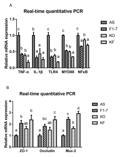 (A) Relative mRNA levels of the inflammatory factors in the intestine, containing the genes of TNF-α, IL-1β, TLR4, MYD88, and NFκB, and (B) mRNA expression of epithelial integrity proteins, Muc-2, occludin, and zonula occludens-1 (ZO-1) (n = 3). Different letters indicate significant differences, p < 0.05.