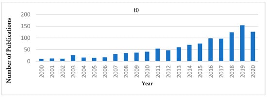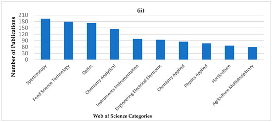 Publication records from the Web of Science database, using the search words “NIR, portable” or “NIR, handheld” or “NIR, hand-held” from 2000 to 2020 (Data accessed on 29 October 2020). (i) Number of publications in each year. (ii) Number of publications for the first ten Web of Science categories.