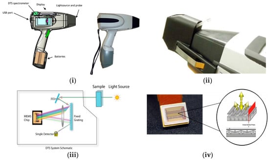 Handheld MEMS Phazir™ spectrometer. (i) The sideview of the Phazir™ spectrometer; (ii) Microphazir™ with a liquid cuvette adaptor (images are originally from []); (iii) Schematic of a post-dispersive instrumental design incorporating MEMS technology (image is originally from []); (iv) MEMS diffraction grating, multi-layer MEMS in reflective state (image is originally from [,,]).
