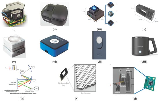 Commercially available handheld NIR devices. (i) DLP, the NIR Scan™ Nano optical engine []; (ii) The NIR-S-G1 sensor based on DLP technology []; (iii) NeoSpectra Micro monolithic MEMS Michelson Interferometer; and (iv) NeoSpectra Scanner []; (v) NIRONE sensor and (vi) NIRONE device (which contains the NIRONE sensor) []; (vii) SCiO spectrometer and (viii) SCiO cup []; (ix) Spectrometer using a DLP DMD and single element detector; and (x) DLP DMD with a close-up of mirror array []; (xi) Michelson interferometer on a MEMS chip []. (All images in Figure 4 are originally from the above cited papers, copyright permission has been granted. Courtesy Texas Instruments for Figure 4i,ix–xi).