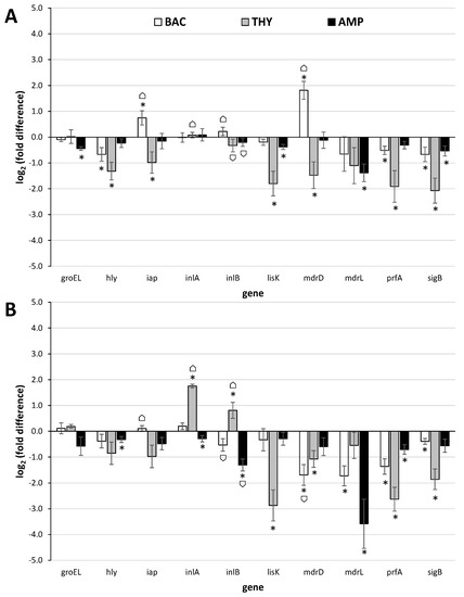 Relative quantification (log2(fold differences)) of the expressions of the 10 target genes (groEL, hly, iap, inlA, inlB, lisK, mdrD, mdrL, prfA, sigB) at the 2 L. monocytogenes strains (A) AAL20066 (ser. 1/2a) and (B) AAL20074 (ser. 4b), following their sublethal exposure (for 2 h at 37 °C) to BAC (4.0 μg/mL; □), THY (312.5 μg/mL;