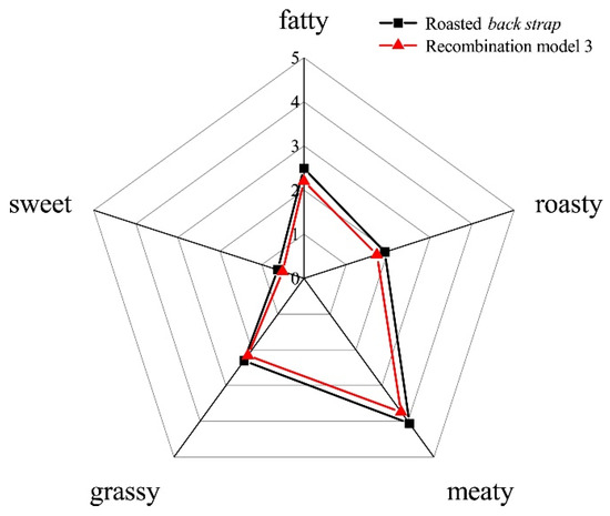 The odorless matrix was constructed with 74.67% ultrapure water and authentic flavor standards (OAVs > 1) in the samples. The recombination model (model 1, 15 odorants) with all aroma compounds with OAVs greater than 1 revealed an extremely high similarity with the original roasted mutton in terms of the aroma profile by the triangle test. The results of the omission experiments (model 2, 14 odorants) indicated that 8 odorants significantly affected the overall aroma profile (p < 0.05) of the samples, including 3-methylbutanal, pentanal, hexanal, heptanal, 2-pentylfuran, octanal, nonanal, and 1-octen-3-ol. In particular, the model without hexanal and 1-octen-3-ol presented a noticeable difference (p < 0.01) compared to the aroma profile in model 1. Finally, the recombination model with the 8 aroma compounds mentioned above (model 3) showed a high similarity (4.51 out of 5 points) in comparison with roasted mutton, as illustrated in Figure 1. In particular, the pre- and postrigor roasted mutton both had fatty, roasty, meaty, grassy, and sweet odors. The intensity of the aroma profile in the postrigor roasted mutton was significantly greater (p < 0.05) than prerigor sample.