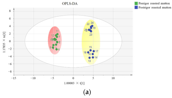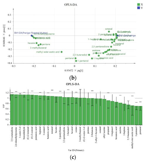 OPLS-DA of aroma compounds in the pre- and postrigor roasted mutton. (a) score scatter plot. (b) loading scatter plot. (c) VIP plot.