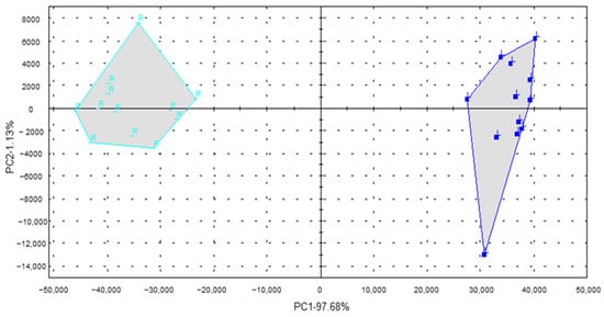 To further quickly determine the differential aroma compounds in the pre- and postrigor roasted mutton, flash GC e-nose and PCA were used. As illustrated in Table 4, 11 aroma compounds were identified in the two samples by flash GC e-nose. Among these, hexanal had the maximum peak area, followed by pentanal, 1-octen-3-ol, and heptanal. In particular, the peak areas of most aroma compounds, including hexanal and 1-octen-3-ol, in the postrigor samples was significantly greater (p < 0.05) than that in the prerigor samples, which was consistent with the GC-O-MS results. PCA of the flash GC e-nose was performed to determine the correlation pattern with individual composition variables in the discrimination between the two samples. As presented in Figure 3, the accumulative variance contribution rate of the first two PCs was 98.81% higher than 85% (PC1 of 97.68% and PC2 of 1.13%), which was sufficient to discriminate between these two samples. The general aroma feature could be well distinguished by a flash GC e-nose coupled with PCA. Based on above analysis, hexanal and 1-octen-3-ol might be potential markers to discriminate the pre- and postrigor roasted mutton.