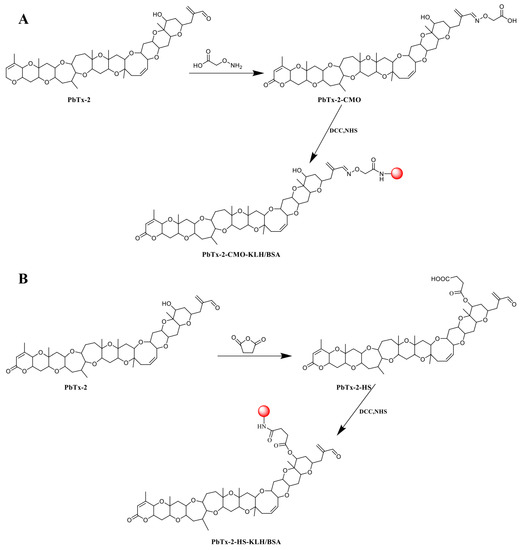 PbTx-2 hapten and antigen synthesis routes. (A) PbTx-2-CMO-KLH/BSA. (B) PbTx-2HS-KLH/BSA.