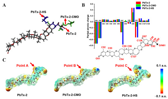 Molecular modeling results. (A) Overlap of PbTx-2 (gray), PbTx-2-CMO (green), and PbTx-2-HS (violet) structures. (B) Calculated partial atomic charges of PbTx-2, PbTx-2-CMO, and PbTx-2-HS structures. (C) ESP for PbTx-2, PbTx-2-CMO, and PbTx-2-HS structures. Red and blue areas indicate negative and positive potentials, respectively.
