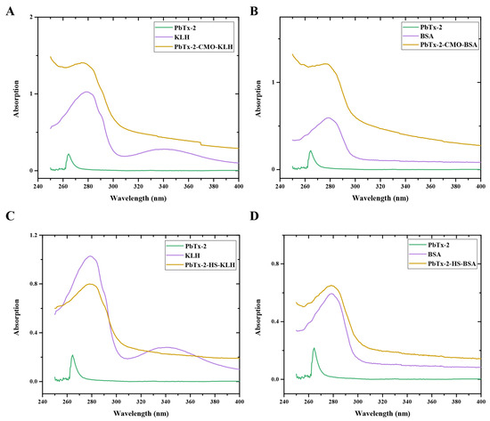 UV–visible absorption spectra of PbTx-2-CMO-KLH (A), PbTx-2-CMO-BSA (B), PbTx-2-CMO-KLH (C) and PbTx-2-CMO-BSA (D).