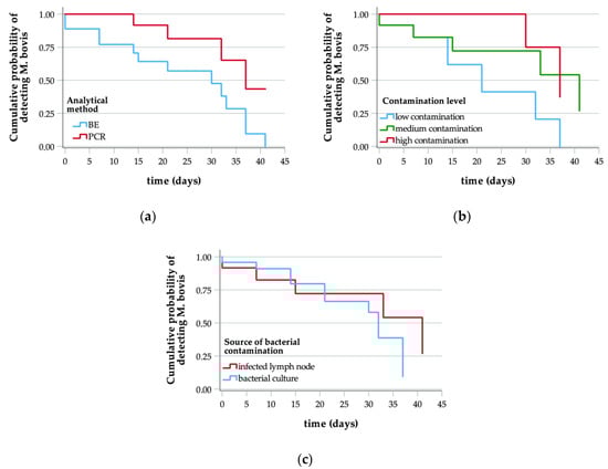 Figure 1b,c present the curves obtained from data separated according to sample contamination level and to the contamination source/procedure, respectively. Concerning the first parameter, the median time value during which detection was achieved was lower for samples from the third batch (12 days), and for both methods the values observed were higher for samples from the second batch. Separately examining the data produced by cultural and molecular analyses, dissimilar images appeared from a comparison of the curves related to the different contamination levels. Namely, for BE the first and the third batches generated similar median values, while the results referred to the second batch clearly differ, proving to be higher than the previous ones. On the other hand, the PCR data produced a curve related to the first batch that showed a median value quite similar to that from the curve of the second batch, and we can point out a lower value only for the batch characterized by a low contamination level. Concerning the second parameter, the median time values were broadly similar, despite a slightly lower value for samples contaminated by adding infected lymph nodes, but by evaluating the data separately according to the analytical technique used, we noticed some differences. All curves produced with the BE results have a similar trend, and detection was possible for a slightly longer period from samples of the group made up from the second and third batches. Instead, for the PCR curves the trend diverged and, although periods enabling pathogen detection were similar to what was observed for BE with regard to the two batches contaminated with bacterial cultures, this period was extended for samples from the first batch and reached the end of the observation period.