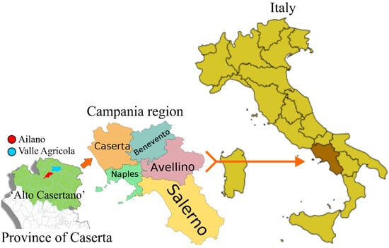 In this scenario, the present work describes the total protein content (caseins and whey proteins) and the total and free amino acid profiles of raw milk from three different local species found in the mountain community of ‘Alto Casertano’ (Campania region, Italy). In particular, the study was carried out on cow, sheep and goat lactating breeds raised in the territory of Ailano (41°23′ N 14°12′ E; elevation: 260 m) and Valle Agricola (41°25′ N 14°15′ E; elevation: 691 m), Figure 1.