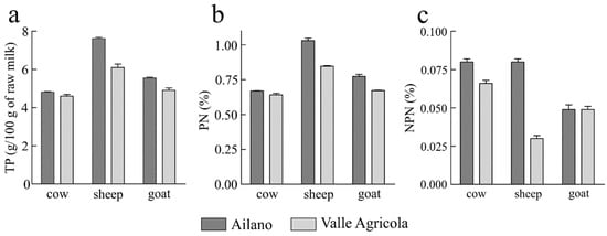 Milk is generally considered an important source of proteins present in different content in cow, sheep and goat milk types (3.2, 6.2 and 3.4 g/100 g of raw milk, respectively). In this study, the average amount of total proteins (TP) as well as protein nitrogen percentage (PN) and non-protein nitrogen percentage (NPN) content of cow, sheep and goat raw milk from ‘Ailano’ and ‘Valle Agricola’ territories are shown in Figure 2.