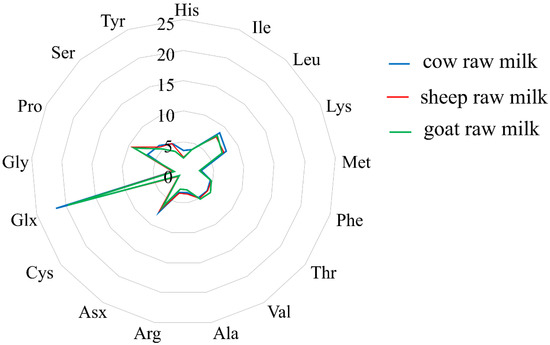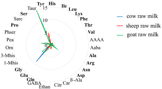 The results discussed in this work demonstrate how the amino acid content of the milks analyzed changes among the different species, which is also shown by the radar chart of the average milk amino acid composition from three different mammal species (cow, sheep and goat), raised in two localities of ‘Alto Casertano’ (Campania region, Italy) (Figure 3).