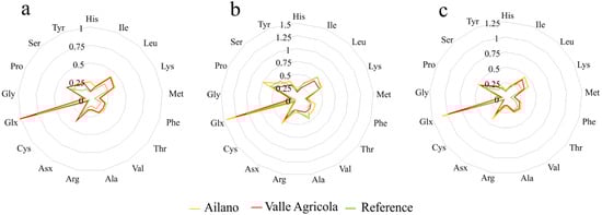 Radar graphs of the total amino acid content from the three types of milk analyzed, sampled in Ailano and Valle Agricola mountain localities, in comparison with the reference values [22]. (a) cow raw milk, (b) sheep raw milk and (c) goat raw milk.