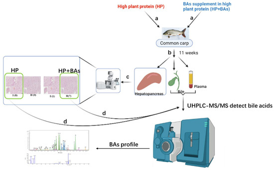 The workflow of the effect in bile acid supplement to high plant protein diet on common carp bile acid profile and hepatopancreas health. Arrows a: Common carp fed with HP and HP+BAs 11 weeks, respectively. Arrows b: Collect hepatopancreas, gallbladder, and plasma. Arrows c: Histopathological detections of hepatopancreas tissues. Arrows d: BAs analysis was performed on the bile and plasma corresponding to phenotype I of the hepatopancreas in the HP group (n = 8), the gallbladder and plasma corresponding to phenotype II of HP+BAs were treated in the same way (n = 7).