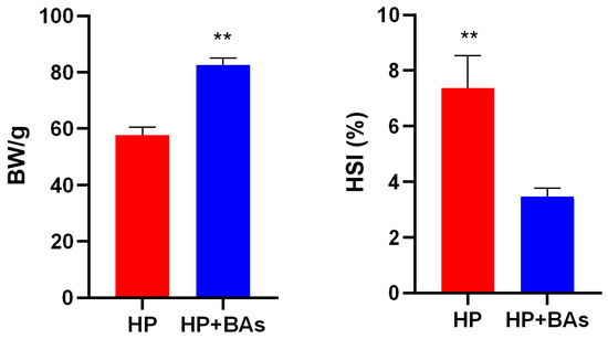 Compared with the HP group, the growth performance of the HP+BAs group improved significantly (p < 0.01) (Figure 2), the final body weight (BW) increased significantly (p < 0.01), and HSI significantly decreased. The mean of HSI in HP and HP+BAs groups were 7% and 3%, respectively.