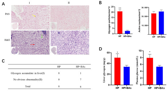 Supplement bile acids to high plant protein feed reduced carp hepatopancreas histological lesions (Statistically significant results were indicated by asterisks (*, p < 0.05; ***, p < 0.001)): (A) PAS and H&E staining of liver sections with bar = 100 μm, intracellular accumulation of glycogen (marked with yellow arrow), deformed cells (marked with green arrow) and Nuclear gathered (marked with yellow arrow) were clearly observed in the damaged hepatopancreas. (B) Quantification of glycogenosome and active nucleus, the number of hepatopancreas glycogenosome in the HP+BAs group carp was significantly lower than that in the HP group. (C) The phenotype of hepatopancreas histopathological examination in HP group and HP+BAs group. (D) Supplement BAs to high plant protein feed reduced hepatopancreas glycogen and plasma glucose (Statistically significant results are indicated by asterisks (*, p < 0.05; ***, p < 0.001), n = 7).