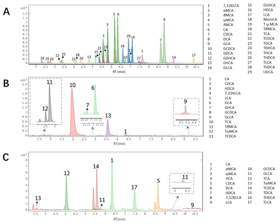 Bile acids Extracted Ion Chromatogram (EIC) in sample and standard; the peak times between bile acids do not interfere with each other. (A) is standard EIC, (B) is for bile sample, and (C) for plasma sample.