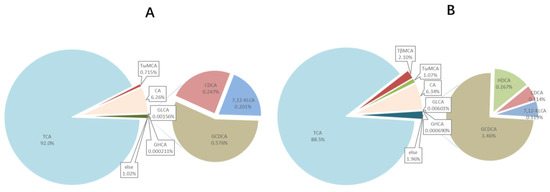 Bile acids species composition in bile, (A,B) for HP and HP+BAs, respectively (n = 7). TCA is the major BA of carp. Compared to HP group carp, the ratio of GCDCA, TβMCA, GLCA, and HDCA increased significantly in HP+BAs group, while TCA and CDCA decreased.