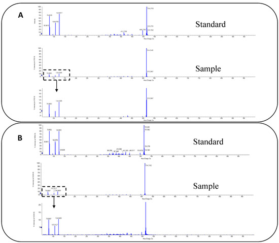 Tandem mass spectrometry (MS/MS) of TβMCA and TωMCA in sample and standard. (A) for TβMCA, (B) for TωMCA. The RT and abundance ratio of MS/MS of TβMCA and TωMCA standard were 2.79 min and 2.37 min, m/z 124.0017:106.9758:80.9615:79.9523 = 6:3:2:4 and m/z 124.0018: 106.9759:80.9611:79.9536 = 40:19:13:40, respectively, which in sample was consistent.