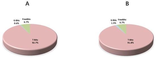 The ratio of GCDCA, TβMCA, GLCA, and HDCA increased significantly in the HP+BAs group, while TCA and CDCA decreased (Figure 6). An increase of BA diversity in the HP+BAs group could be observed in both bile and plasma. Supplementary BAs to a high plant protein diet increased the proportion of G-BAs in bile, which accounted for 0.6% and 1.5% in the HP group and HP+BAs group, respectively (Figure 7).