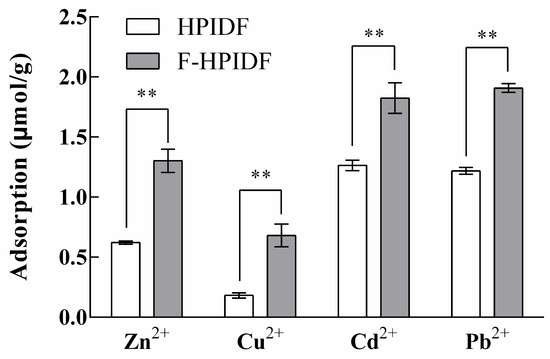 3.4.3. Potentially Harmful Substances-Adsorption Capacity of HPIDF/F-HPIDF