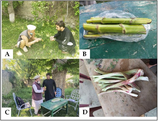 Plants found in some homes in the study area; (A,C) local informants explaining the uses of WFPs (B) Ferula hindukushensis and (D) Rheum ribes.