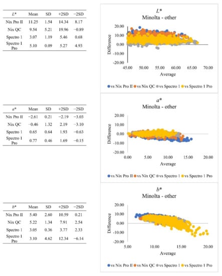 - Holman, B.W.B.; Hopkins, D.L. A comparison of the Nix Colour Sensor Pro™ and HunterLab MiniScan™ colorimetric instruments when assessing aged beef colour stability over 72 h display. Meat Sci. 2019, 147, 162–165. [Google Scholar] [CrossRef] [PubMed]