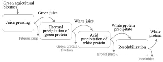Most published studies on protein fractionation from green biomass for food applications have applied a relatively gentle extraction process, to maintain the desirable functional properties of the proteins [18]. This process generally consists of three main steps (Figure 1): (i) pressing liquid from fresh or frozen green leaves to obtain a green juice (GJ); (ii) separating the green and white protein fractions by exploiting differences in thermal sensitivity of the proteins, to create white juice (WJ) and a green protein fraction [11,13,18,19,20,21]; and (iii) concentrating the white protein fraction in the WJ further, by heating at 80 °C [19], acid precipitation at pH between 3.5 and 4.5 [13,16,22,23,24], chromatography [20], or filtration [11,17].